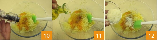 Adicione também uma pitada de pimenta 10, o sal, um fio de azeite 11 e o Parmesão ralado 12.