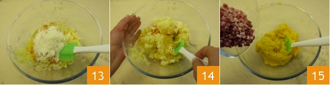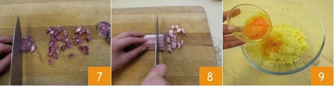 Corte o salame tipo Napoli em cubos de cerca de 1 cm 7, depois faça o mesmo com a fatia de presunto cozido 8. Neste ponto, pegue as batatas recém-amassadas e adicione os ovos 9.