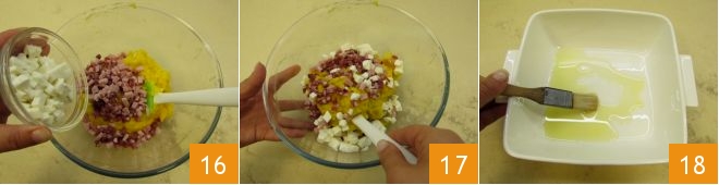 Despeje na tigela também a mussarela escorrida 16 e misture tudo 17. Neste ponto, unte uma assadeira quadrada de 20x20 cm 18.