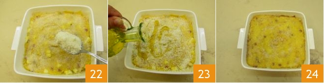 Polvilhe a superfície com farinha de rosca e Parmesão 22, regue novamente com um fio de azeite 23 e asse em forno estático pré-aquecido a 180° por cerca de 30 minutos. Quando uma crosta dourada se formar, seu gateau de batatas com salame está pronto para ser servido 24!