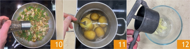 Ajuste o sal e a pimenta 10; acrescente a melhorana e desligue o fogo. A essa altura as batatas devem estar cozidas. Faça o teste espetando‑as com um garfo 11. Escorra‑as, deixe‑as amornar um pouco e, ainda quentes, passe‑as pelo espremedor de batatas 12, recolhendo o purê em uma tigela.