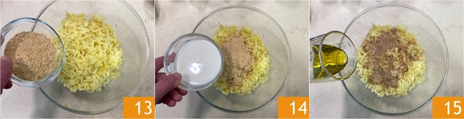Junte às batatas amassadas a levedura nutricional 13, a bebida vegetal de aveia 14 e o azeite extravirgem 15