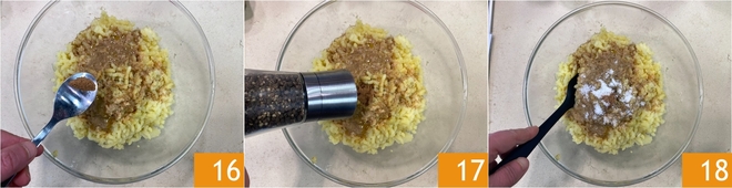 Acrescente também a noz‑moscada 16, o sal e a pimenta 17. Misture bem com uma espátula 18.