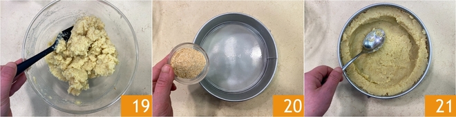 Você deve obter uma massa cremosa e homogênea 20. Unte uma forma redonda de 22 cm e polvilhe o fundo com farinha de rosca 20. Despeje metade das batatas na forma e pressione‑as com as costas de uma colher de modo a deixar as bordas mais espessas 21, criando assim uma cavidade para o recheio.