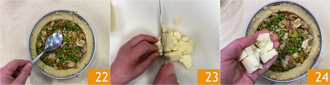 Acrescente todo o recheio e distribua‑o de modo uniforme 22, corte o queijo em pedaços 23 e coloque‑o por cima dos legumes 24.