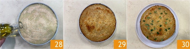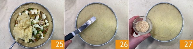 Cubra com o restante da mistura de batatas 25, nivele delicadamente a superfície 26, complete com uma polvilhada de farinha de rosca 27.