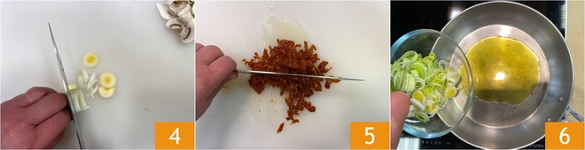 Pegue o alho‑poró, retire as folhas mais externas e corte‑o em fatias finas 4. Pique também os tomates secos grosseiramente, com uma faca 5. Em uma frigideira aqueça o azeite extravirgem e junte o alho‑poró fatiado finamente 6.