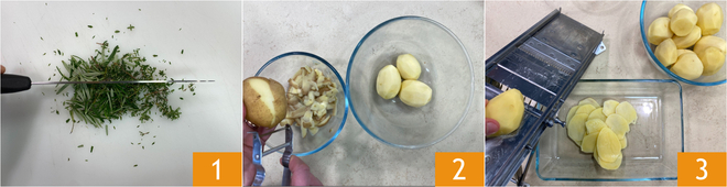 Para preparar o gratinado de batatas, comece picando o alecrim 1 e reserve. Depois, descasque as batatas 2 e corte-as com um mandolim em fatias de cerca de 3 mm de espessura 3.