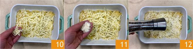 Cubra a superfície com a muçarela ralada 10, adicione então o queijo ralado 11 e uma pitada de pimenta 12. Continue assim até acabar os ingredientes, ao final você deve obter 6 camadas de batatas.
