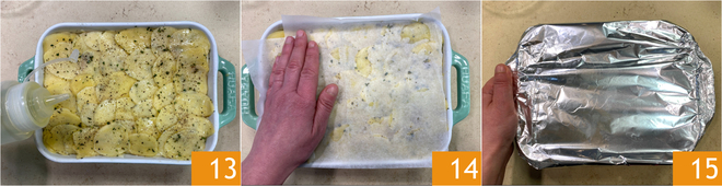 Tempere a última camada com óleo 13, cubra primeiro com um papel manteiga 14 e depois com uma folha de alumínio 15. Asse em forno estático a 220°C por 70 minutos.