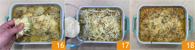 Após esse tempo, verifique se as batatas estão cozidas, então adicione à superfície do gratinado a muçarela 16 e o Parmesão 17. Conclua o cozimento na mesma temperatura em modo grill por 5-8 minutos. O gratinado de batatas está pronto para ser servido 18.