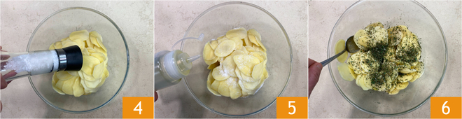 Tempere-as com sal 4, pimenta, óleo 5 e o alecrim picado. Misture bem 6, para que o tempero se distribua por todas as fatias 6.