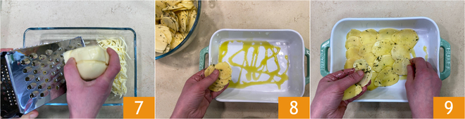 Com um ralador de furos grandes, rale a muçarela 7 e reserve. No fundo de um refratário de 25x10,5 cm, coloque um fio de óleo e disponha as fatias de batata para formar a primeira camada 8 9.