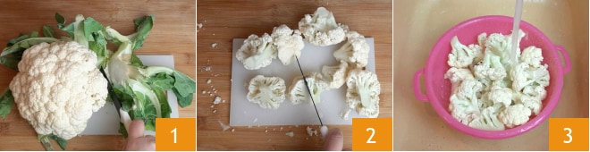 Para preparar o gratinado de couve-flor e radicchio, limpe a couve-flor retirando as folhas verdes 1 e o talo central, e sempre com a ajuda de uma faca de lâmina lisa, separe todos os floretes, dividindo ao meio os maiores 2. Transfira os floretes limpos para um escorredor e enxágue sob água fria 3.