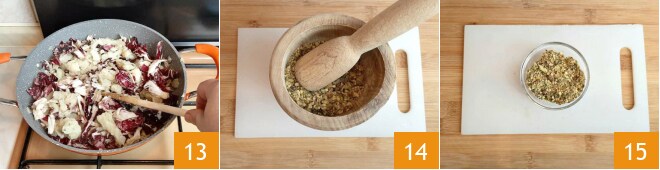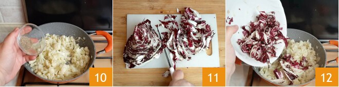 e a pimenta 10, mexa e deixe apurar por 5-6 minutos. Enquanto isso, limpe o radicchio retirando o talo central, fatie finamente 11 e adicione à panela com a couve-flor 12, mexa e salteie por alguns segundos para não murchar muito
