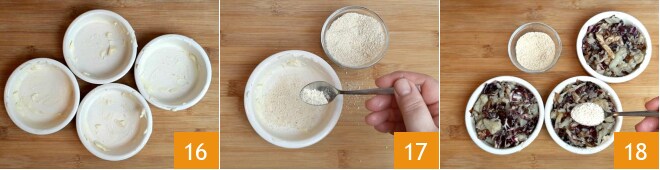 Pré-aqueça o forno a 200°C em modo estático. Unte com manteiga 4 cocottes com cerca de 11 cm de diâmetro 16 e polvilhe o interior com farinha de rosca 17. Encha cada cocotte com a couve-flor e o radicchio, adicione uma pitada de farinha de rosca na superfície 18