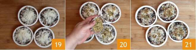 e uma colher de chá de Grana Padano ralado 19. Finalize com o pistache triturado 20 e leve ao forno por cerca de 15 minutos, gratinando nos últimos minutos de cozimento com o grill para dourar a superfície. Retire as cocottes de couve-flor e radicchio com pistache do forno e sirva quente 21.