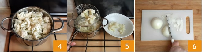 Coloque uma panela cheia de água no fogo e, assim que ferver, mergulhe os floretes de couve-flor 4, cozinhando-os por cerca de 10 minutos; a consistência deve permanecer um pouco al dente, pois será salteado na panela e depois cozido no forno. Escorra a couve-flor em uma tigela e reserve 5. Limpe a cebola e fatie finamente 6.