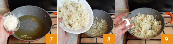 Aqueça um fio de óleo em uma panela, adicione a cebola 7 e refogue em fogo baixo, em uma panela grande. Assim que a cebola estiver dourada, adicione a couve-flor 8, ajuste o sal 9