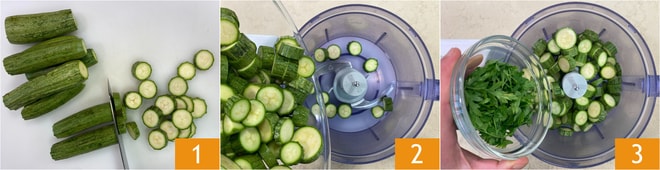 Para preparar o guacamole de abobrinha, primeiro lave e corte as pontas das abobrinhas, depois corte-as em rodelas 1. Transfira as abobrinhas para um mixer 2 e adicione as folhas de coentro 3.