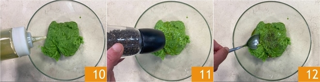 Tempere com um fio generoso de óleo 10 e uma pitada de pimenta 11, depois ajuste o sal e misture bem 12.