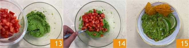 Por fim, adicione os tomates cortados em cubos 13 e misture-os ao creme 14. Seu guacamole de abobrinha está pronto para ser servido, talvez guarnecido com algumas fatias de limão 15!