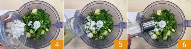 Adicione também a cebola picada grosseiramente 4, o suco de limão 5 e o sal 6.