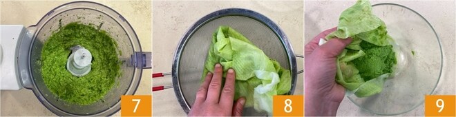 Bata até obter uma mistura cremosa 7. Despeje o purê em uma peneira forrada com papel absorvente e pressione para retirar o excesso de líquido 8. Uma vez escorrido, transfira o creme para uma tigela 9.