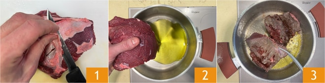 Para preparar a bochecha de boi com alcachofras, primeiro prepare o Caldo de carne com a nossa receita e mantenha aquecido. Limpe a carne removendo a membrana 1. Em uma panela, coloque um fio de óleo, adicione a carne 2 e doure em fogo alto por cerca de 2 minutos de cada lado.