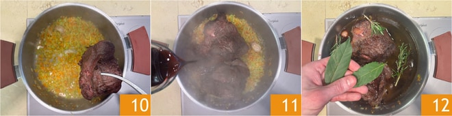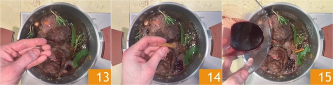 Coloque novamente a carne na panela 10, cubra com o vinho restante (cerca de um litro) 11 e leve à fervura. Neste ponto, adicione o alecrim e o louro 12.