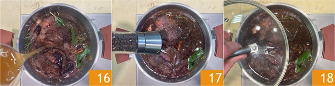 Cubra com o caldo quente 16, sal e pimenta 17. Aguarde voltar a ferver, depois abaixe o fogo e cozinhe com a tampa por cerca de 3 horas 18.