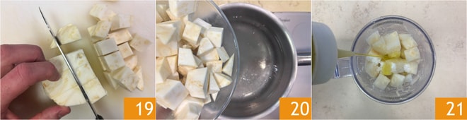 Enquanto isso, prepare o acompanhamento. Limpe o aipo-rábano e corte-o em cubos 19, depois cozinhe-o em água fervente salgada por 15-20 minutos 20. Escorra e transfira o aipo-rábano para um copo, depois adicione o óleo 21.