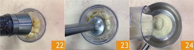 Ajuste o sal e a pimenta 22, em seguida, bata com um mixer de imersão 23 até obter um creme liso e homogêneo. Transfira para uma panela e mantenha aquecido 24.