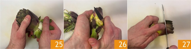 Agora passe para a Como limpar alcachofras: remova as folhas externas mais duras 25, depois encurte o caule e descasque-o começando da base da alcachofra 26. Corte as pontas 27.