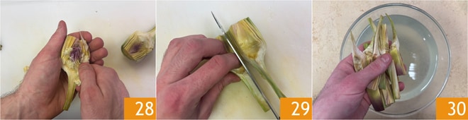 Divida as alcachofras ao meio e remova a penugem interna 28, depois corte em quartos 29 e mergulhe imediatamente em água com limão 30.