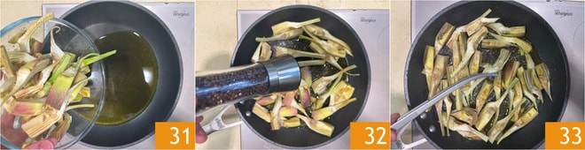 Em uma frigideira, coloque um fio de óleo, adicione as alcachofras 31, sal e pimenta 32. Salteie em fogo médio por cerca de 6-7 minutos ou até dourar 33.