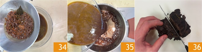 Após o tempo de cozimento da carne, retire-a da panela e coe o fundo de cozimento 34. Despeje novamente na panela a parte líquida 35 e reduza no fogo por cerca de trinta minutos em fogo médio-baixo; você deve obter uma glaçagem com consistência densa o suficiente para velar a colher. Enquanto isso, fatie a carne 36.