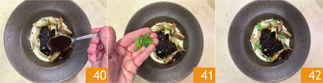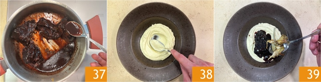 Coloque a carne de volta na panela e regue com a glaçagem 37. Emprate distribuindo no fundo do prato uma camada de creme de aipo-rábano 38, depois coloque a carne por cima e adicione as alcachofras ao redor 39.