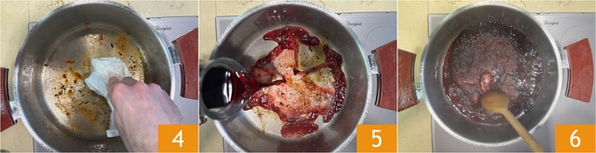 Remova a carne da panela e limpe o fundo com papel absorvente 4, depois acrescente um copo de vinho da quantidade total 5 e deglaça o fundo 6. Reserve o fundo de cozimento.