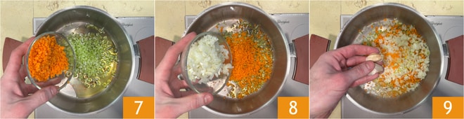 Na mesma panela, aqueça outro fio de óleo, depois adicione o aipo, a cenoura 7 e a cebola 8 finamente picados. Junte também os dentes de alho com casca 9 e refogue em fogo médio por alguns minutos, até que os vegetais estejam macios.