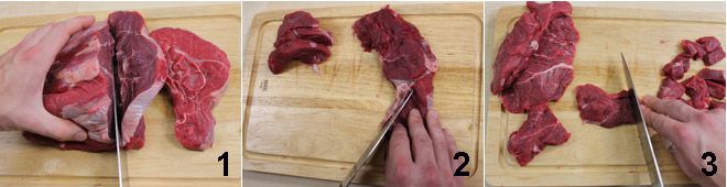 Para preparar o guisado à Guinness, pegue um grande pedaço de carne e corte-o em fatias com cerca de 2 cm de espessura 1, elimine as partes gordurosas 2 e corte-as ainda mais em cubos de cerca de alguns cm de espessura 3.