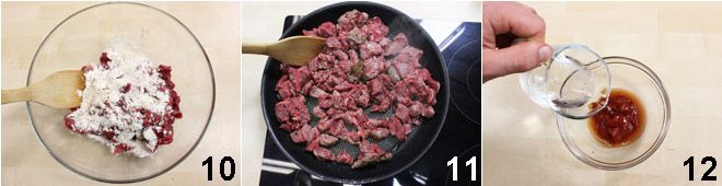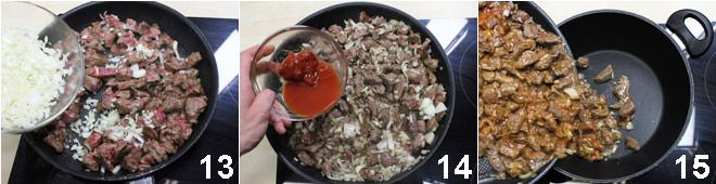 Depois aqueça um par de colheres de sopa de óleo em uma panela antiaderente, assim que o óleo estiver quente, adicione a carne, deixe dourar por pelo menos 15 minutos em fogo alto, mexendo de vez em quando 11. Dilua o extrato de tomate com cerca de 100 ml de água quente 12.