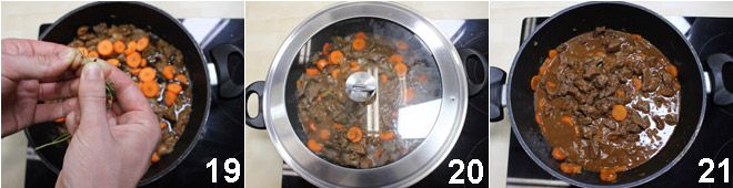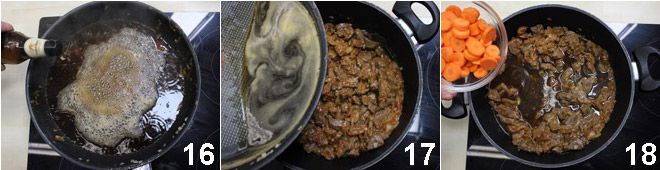e despeje a Guinness na panela onde você dourou a carne anteriormente, este procedimento fará com que a cerveja absorva todos os sabores que se formaram com o dourar da carne, deixe a cerveja evaporar em fogo moderado por alguns minutos 16. Despeje o líquido assim obtido junto com a carne 17, e adicione as cenouras em rodelas 18.