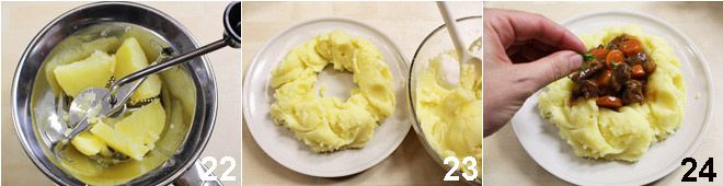 Ferva as batatas, descasque-as e coloque-as em um espremedor de alimentos ainda quentes, salgue o purê obtido e sirva, criando uma coroa na qual você colocará o guisado à Guinness.