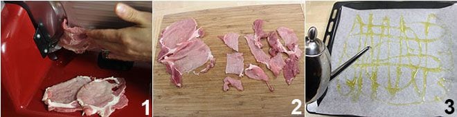 Para preparar o gyros, comece fatiando finamente a carne, com a ajuda de uma fatiadora, pois deve ser muito fina 1 e reduza as fatias em pedaços menores 2. Forre uma assadeira com papel manteiga, unte-a 3