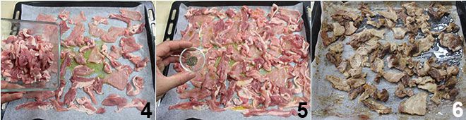 e coloque os pedaços de carne por cima 4. Tempere com uma pitada de pimenta preta 5 e asse em forno pré-aquecido a 180° por 30 minutos 6: a carne deve estar bem cozida e crocante.