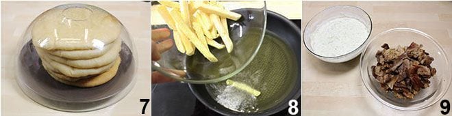 Prepare as pitas seguindo o procedimento que você encontra aqui (Pita) e assim que saírem do forno, deixe-as sob uma cúpula de vidro até o momento de usar 7. Frite as batatas fritas 8 e mantenha-as aquecidas, depois coloque a carne em uma tigela e pegue o tzatziki 9, que você já terá preparado de acordo com as instruções que você encontra aqui (Tzatziki).