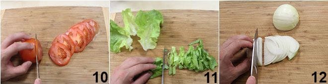 Corte todos os vegetais que vão rechear o gyros: lave os tomates e corte-os em fatias 10, lave a alface e corte-a em pedaços menores 11 e fatie a cebola branca finamente 12.