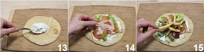 Agora você pode montar seus gyros: em cada pita espalhe uma colher de tzatziki 13, recheie com um pouco de alface, fatias de tomate e alguns fios de cebola 14. Adicione a carne e para completar algumas batatas fritas 15. Feche o gyros começando pela parte inferior, aqueça por alguns minutos no forno e sirva quente!