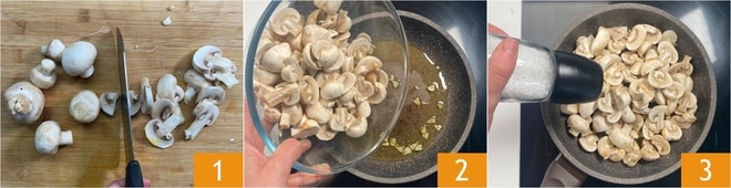 Para preparar o burger de cogumelos, primeiro retire a base terrosa dos champignons, depois corte-os grosseiramente 1. Em uma frigideira, faça um refogado com o azeite e o alho cortado em fatias, depois adicione os cogumelos 2 e salgue imediatamente 3.